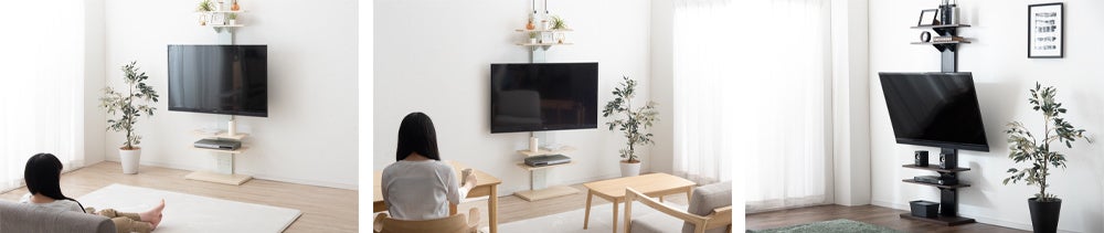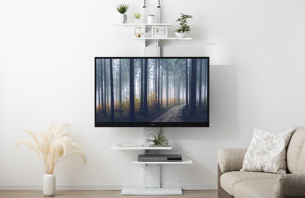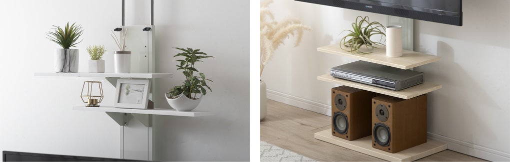 「お部屋を彩る壁面ディスプレイがTVスタンドに!」アレンジ可能な収納棚を搭載した突っ張り式テレビスタンドが登場