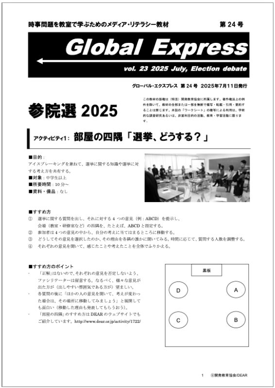 認定NPO法人 開発教育協会(DEAR)は、時事問題を教室で扱うメディア・リテラシー教材『グローバル・エクスプレス』第24号(2025年7月10日発行)を公開しました。今回は「参院選2025」をテーマに、選挙を通じて外交や防衛、多文化共生について考える2つのアクティビティを紹介しています。この教材は参院選2025に対応していますが、選挙が終わったあとでも「これからの社会や政治との関わり」を考える対話のきっかけとして活用できます。