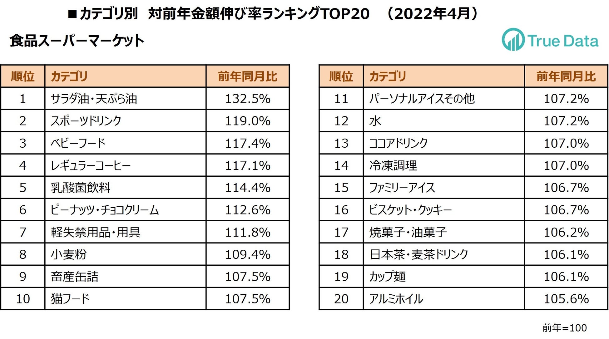 株式会社True Data(トゥルーデータ/本社:東京都港区、代表取締役社長:米倉 裕之)は、当社の統計データをもとに、ドラッグストア、食品スーパーマーケットにおける2022年4月の売り上げ伸長カテゴリを発表します。食品スーパーマーケットでは値上げが話題になっている「サラダ油・天ぷら油」が前年同月に比べ約3割売り上げを伸ばした他、「レギュラーコーヒー」、「小麦粉」も伸長しました。また、花粉の飛散が前年に比べて遅かった影響か、ドラッグストアでは「鼻炎用薬」が前年同月と比べ約5割売り上げを伸ばしました。