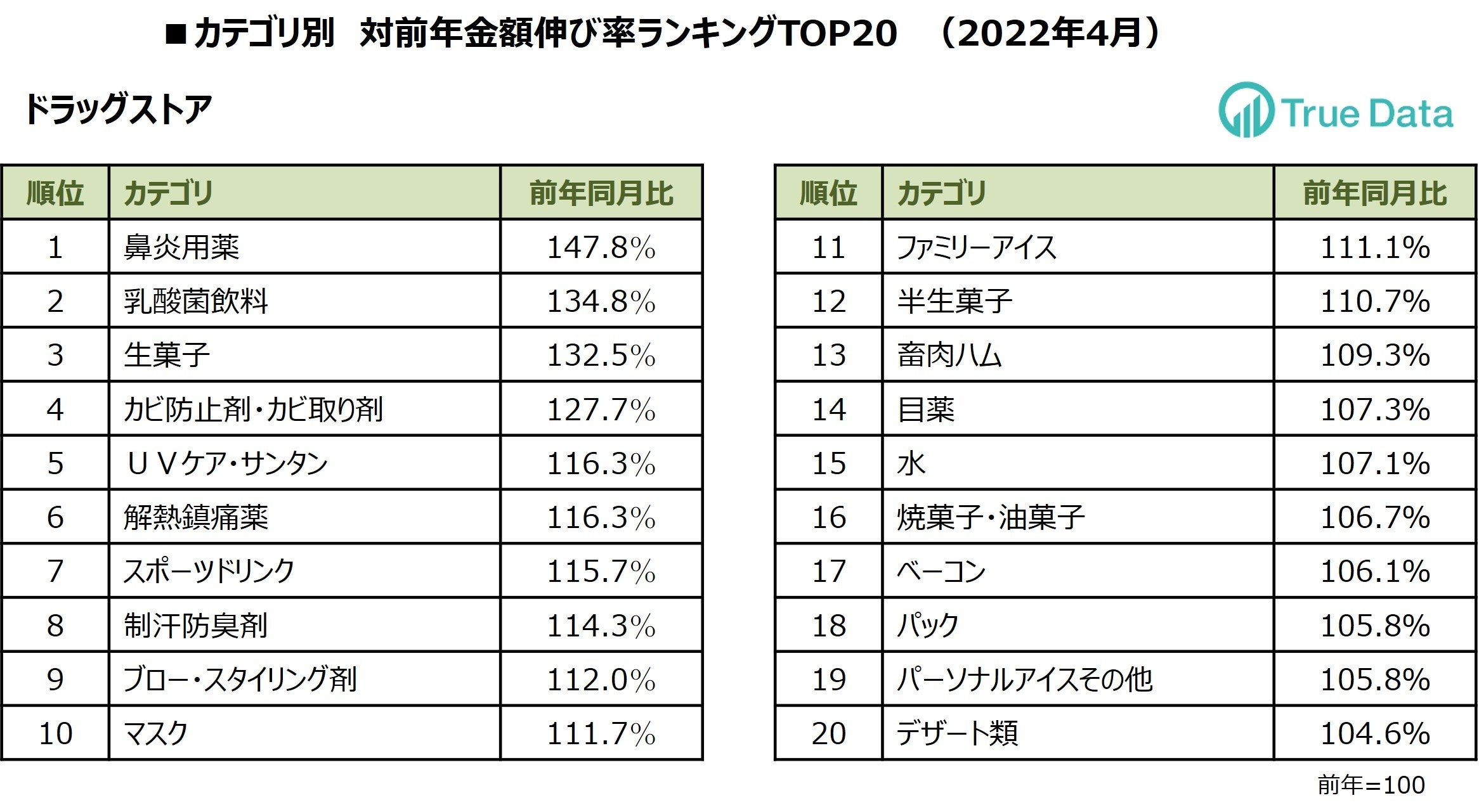 ドラッグストア、食品スーパーマーケット 2022年4月の対前年伸び率TOP20カテゴリを発表