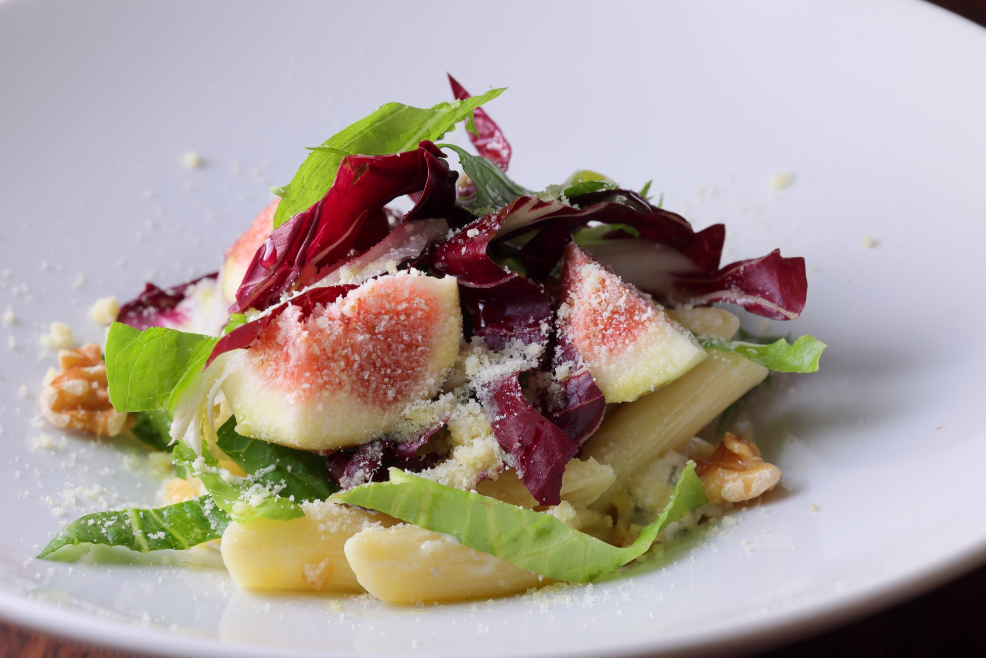 自家製無花果の葉の塩漬けで無花果の香りをまとわせ、追熟させたフランス乳牛で作った癖のないブルーチーズをソースにしてペンネに絡めました。香ばしい胡桃とトレヴィスなどのほろ苦い葉物野菜、無花果のサラダとともにお楽しみください。