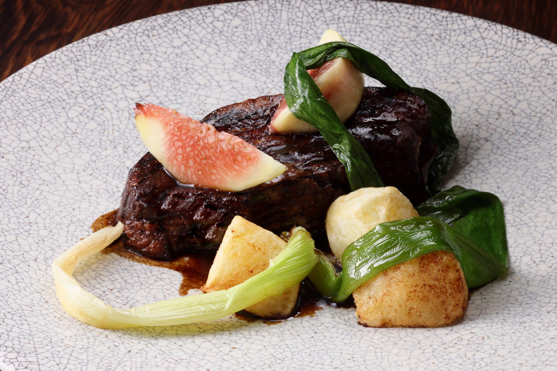 自家製無花果の葉の塩漬けでマリネしたあとにスチームし、再度ソースとともに煮込んだ三段仕込みの京もち豚を、ほどよい酸味のフランスセレスタン社のバルサミコ酢で仕上げました。