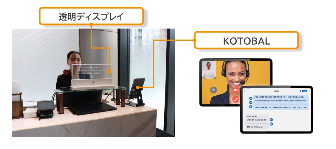 「KOTOBAL」は、32言語に対応しているAI通訳(機械通訳)とヒト通訳が選べるハイブリッド型通訳サービスで、通訳された言語は透明ディスプレイに表示させることができます。昨今の訪日外国人の増加により、宿泊施設や自治体で多言語に対応できる人材確保の難しさや人件費増加の課題がある中、「KOTOBAL」はAIを活用することで、人に依存せずに訪日外国人との円滑なコミュニケ―ションの仕組みをご提案しています。