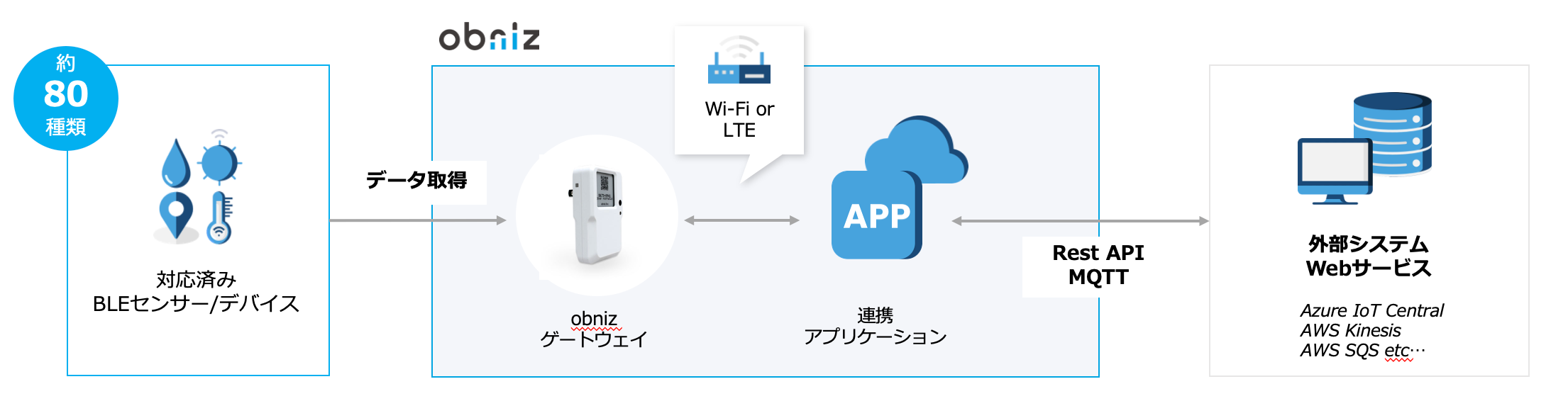 obnizは、IoTに必要な機能や要素を含んだ共通のIoTインフラ、アプリケーションをIoTプラットフォームとして提供しています。このプラットフォームを使用することで、各種センサー/デバイスとITシステム、Webサービスを簡単につなぎ、IoTシステムやサービスを短期間かつ低価格で立ち上げることができます。