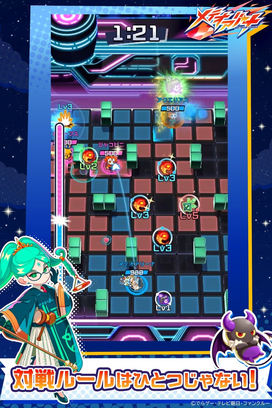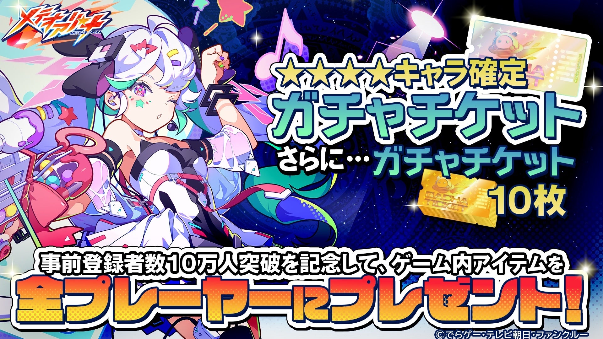 株式会社でらゲー(本社:東京都渋谷区、代表取締役:家次栄一、以下「でらゲー」)は、株式会社テレビ朝日(本社:東京都港区、代表取締役会長:早河洋、以下「テレビ朝日」)と共同開発中のスマートフォンゲーム『メテオアリーナ』の正式サービスが開始されたことをお知らせいたします。また、事前登録者数10万人突破を記念して、ガチャチケット10枚と★4キャラ確定ガチャチケットの配布も決定いたしました。