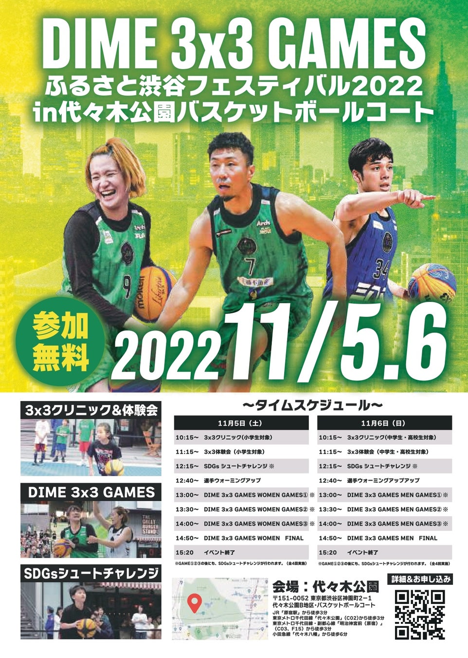 このたびTOKYO DIMEは、11月5日(土)~6日(日)に代々木公園にて開催される渋谷区内での最大規模のお祭り「ふるさと渋谷フェスティバル2022」において、子ども向けのクリニックや3x3体験会、トップレベルの3x3を披露するDIME 3x3 GAMES、TOKYO DIMEが掲げる「DIME GREEN SDGs」の活動の一環としてSDGsシュートチャレンジを行います。