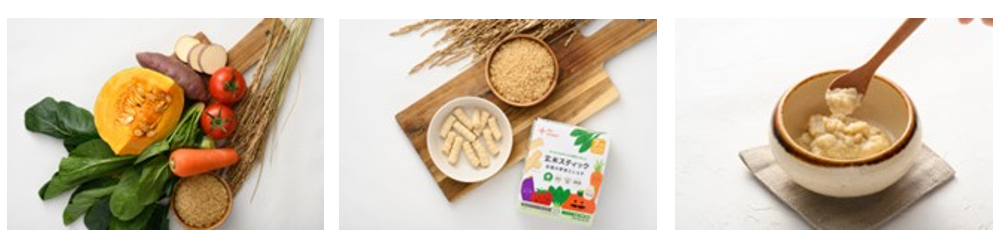 今回発売する「玄米スティック 6種の野菜としらす」は、国産コシヒカリの発芽玄米を99%使用し、食塩・砂糖など不必要な食材などは含まれていません。また、1袋(6g)に育ち盛りの子どもが1日に必要な鉄1/4*1を含み、噛む力を育てるようスティック形状にしました。