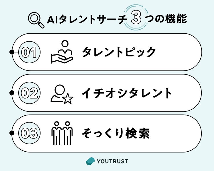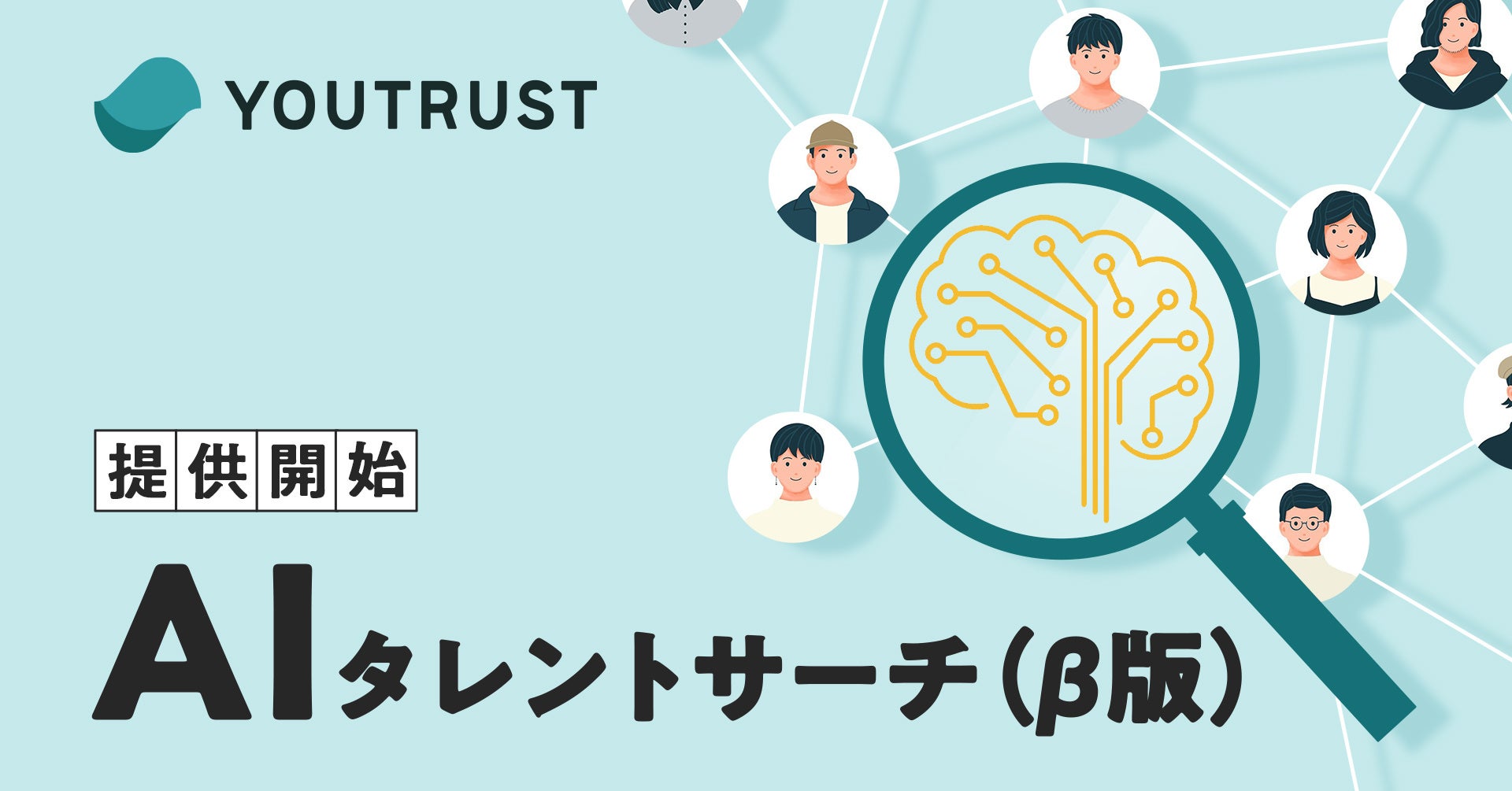キャリアSNSおよびHR Tech SaaS「YOUTRUST」を提供する株式会社YOUTRUST(本社:東京都渋谷区、代表取締役CEO:岩崎由夏)は、2022年10月13日より有料法人企業向けに提供するHR Tech SaaSサービス内において、新たに「AIタレントサーチ(β版)」を提供することをお知らせいたします。YOUTRUSTが独自に開発したAIが、ご契約企業様のYOUTRUSTでの採用活動を元に、①タレントピック ②イチオシタレント ③そっくり検索 の3つの方法で、より簡単に優秀なタレントを検索・レコメンドする仕組みとなっています。