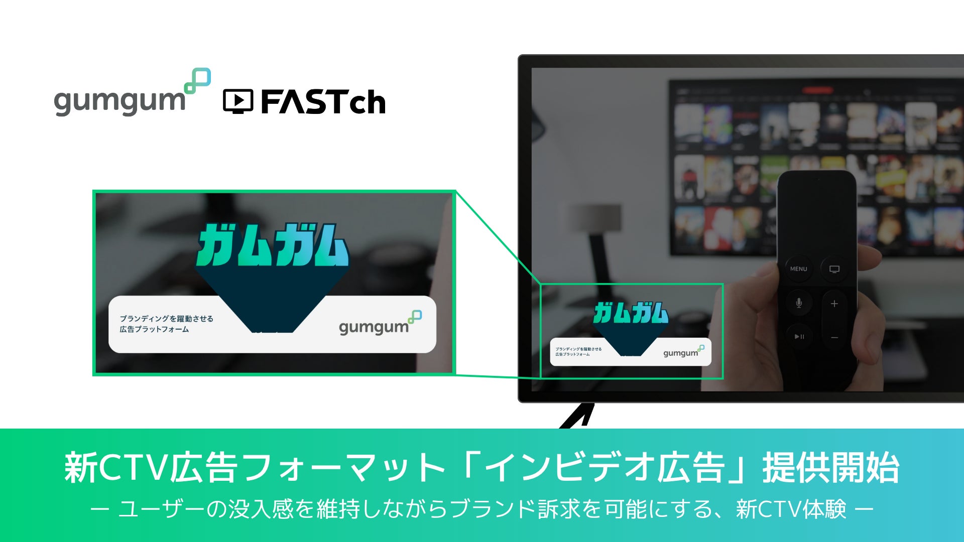 コンテクスチュアル広告のグローバルリーダーであるGumGum Japan株式会社と、無料広告型ストリーミングテレビ (FAST: Free Ad-supported Streaming TV) サービス「FASTチャンネル (FASTch) 」を展開するFAST株式会社は、両社の連携により、映像コンテンツに自然と溶け込む新しいコネクテッドTV (CTV) 広告フォーマット「インビデオ広告」の国内提供を開始いたしました。
