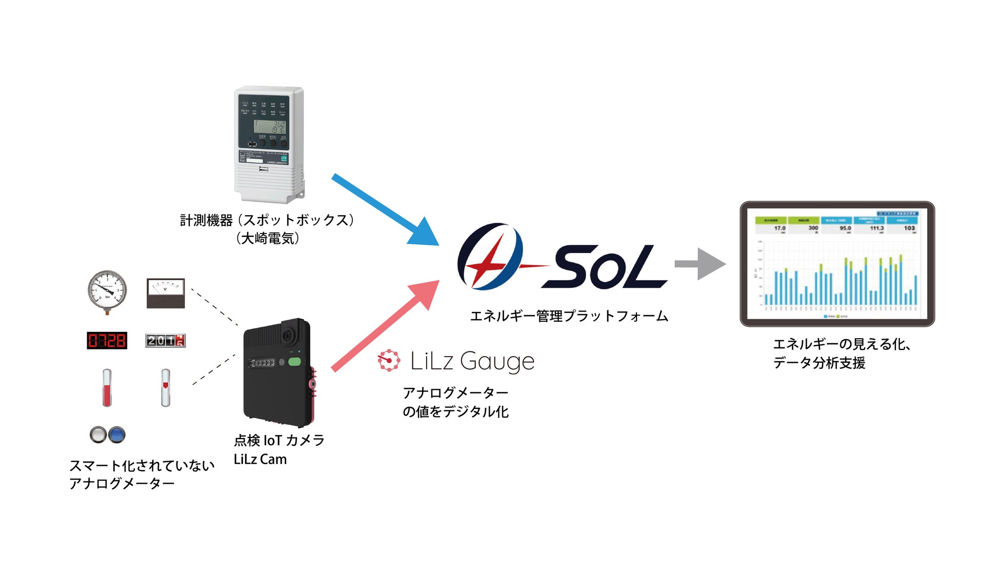 この連携により、「スポット計測サービス」の分析対象がアナログメーター情報の読み取りに拡大されました。LiLz Gaugeによってデジタル化されたデータは、エネルギー管理プラットフォームO-SOL(オーソル)を通じてクラウド上で確認・分析することができるようになり、より精度の高いエネルギー使用状況の分析が可能となります。