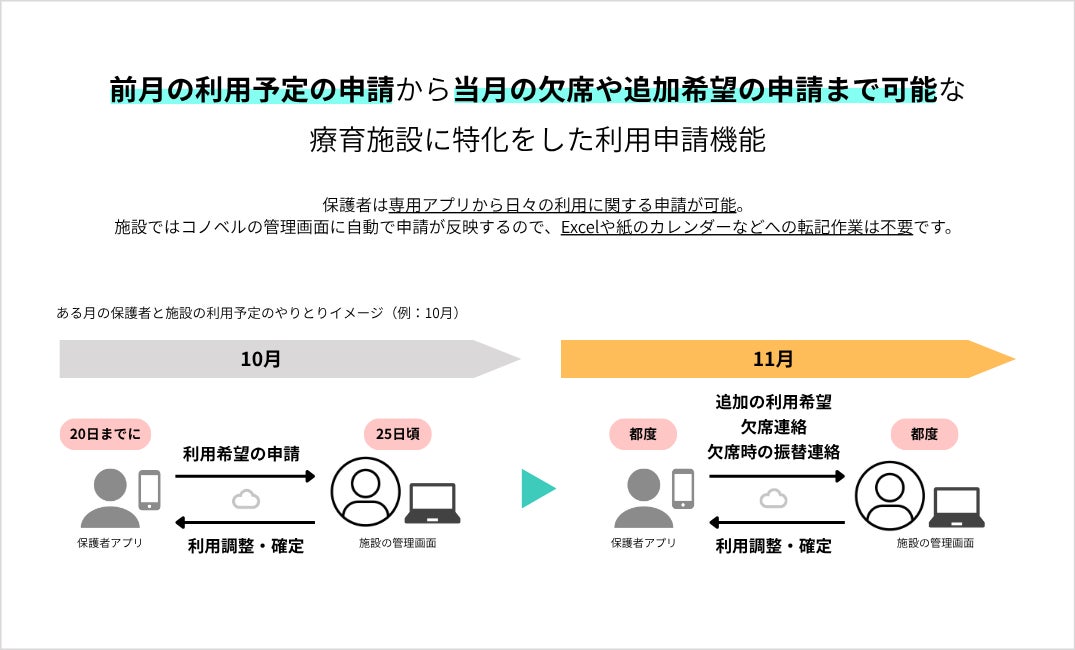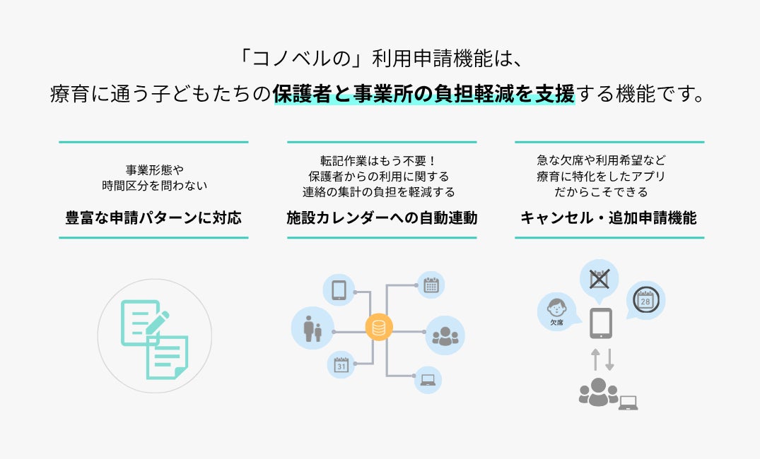 こうした療育現場の声を基に、コノベルではより多くの事業所様と保護者の方の負担の軽減を支援すべく、新たに利用申請機能のリニューアル提供を行うこととなりました。