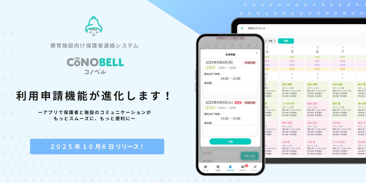 VISH株式会社(所在地:愛知県名古屋市、代表取締役:田淵浩之)が提供する、児童発達支援・放課後等デイサービス向け業務効率化クラウドサービス「コノベル」は、2025年10月6日(月)より、保護者からの日々の利用予定をスムーズに受け付ける「利用申請機能」をリニューアルリリースいたします。