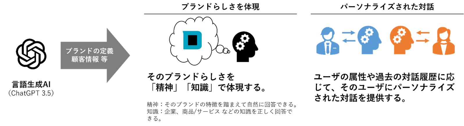 「Brand Dialogue AI」は、OpenAI※社のChatGPTにブランドコミュニケーションの起点となるブランド人格を反映したオリジナルの言語生成AIをベースに、各企業が保有するパーソナルデータや商品データ、コンテンツデータを、ユーザーおよび対話内容に応じて瞬時にプロンプトを入れ替える独自技術の「ダイナミックプロンプト」で反映することで、ブランドの思想に沿って各顧客とOne to Oneの対話を実施することを可能にします。