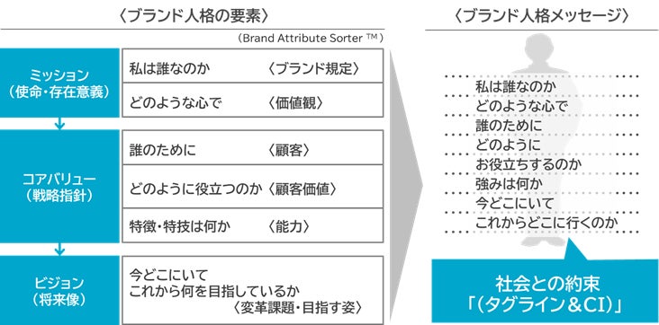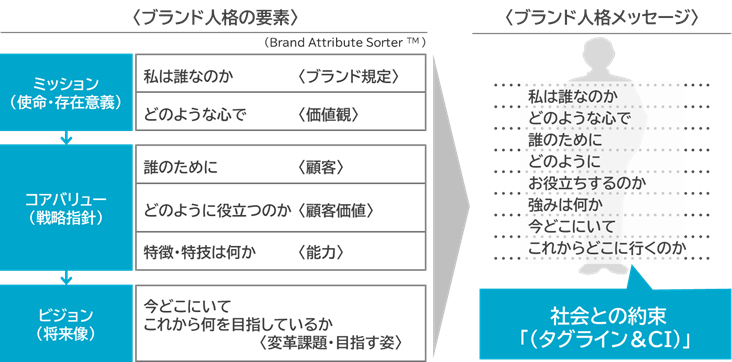 「ブランド人格」とは、その企業・事業の成長意志と独自要素を一人の「人格」として描き出す大広独自のメソッドです。ブランドの独自要素を「ミッション」「戦略指針」「ビジョン」という視点で読み解き、これらの繋がりを個性を持った一人の人間の自己紹介ストーリーとして描き出します。この「ブランド人格」が、すべての企業/事業活動の基点となります。