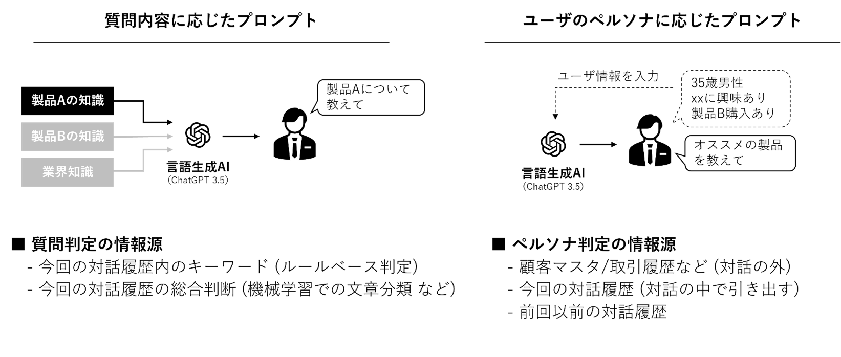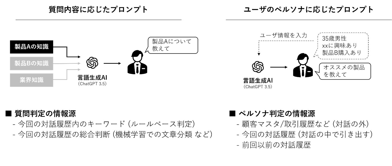 ダイナミックプロンプトは、ユーザー属性と質問内容をベクトル化して、データベース(パーソナル情報、商品情報、知識情報など)より最適なデータの検索を行い、検索結果をプロンプトへ反映するBrand Dialogue AI独自の技術です。