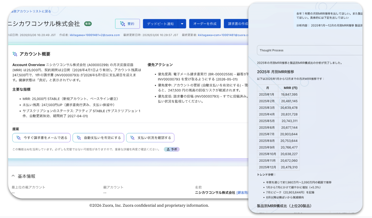 Zuora AIは現在、すべてのお客様に提供されています。カスタマイズやエージェント機能の有効化にも対応しています。詳細については、当社Webサイト(https://www.zuora.com/jp/ai/)をご覧ください。