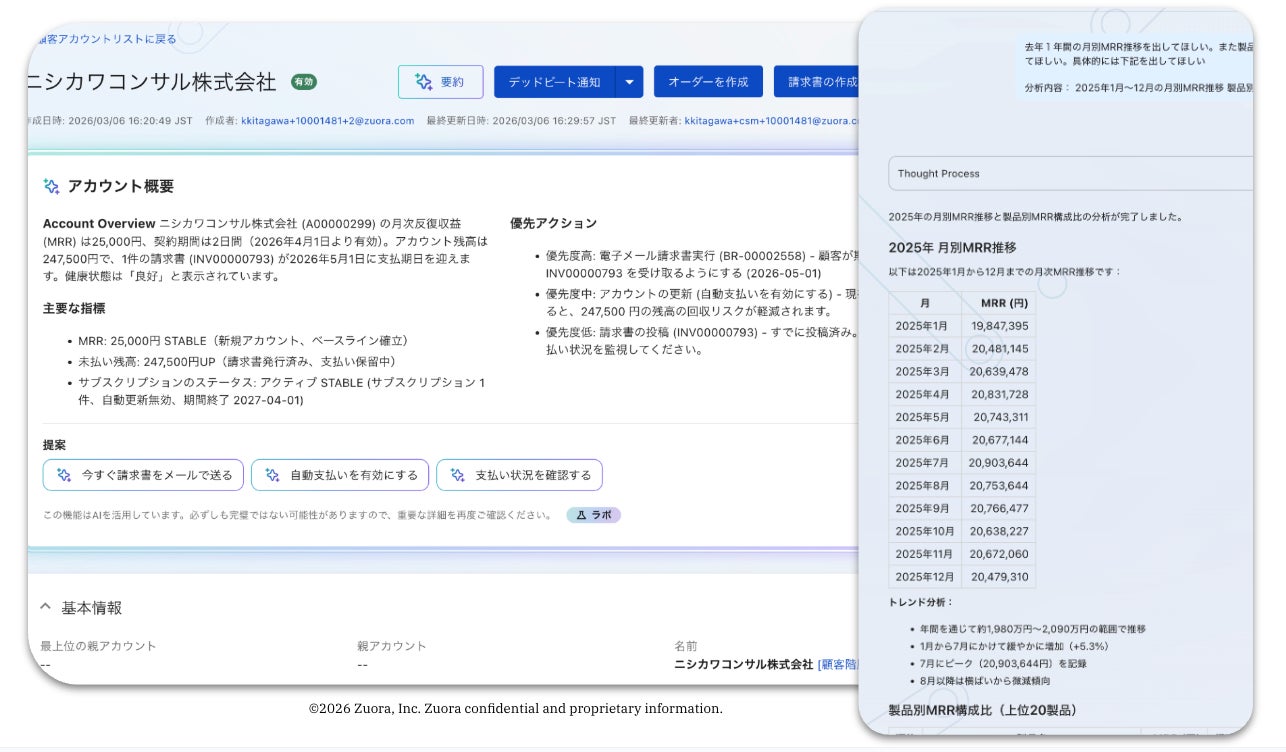 請求書、入金、サブスクリプション、リスク情報などを横断し、アカウントごとの財務状況を即座に把握。複数画面を行き来することなく、要約・インサイト・推奨アクションを提示します。