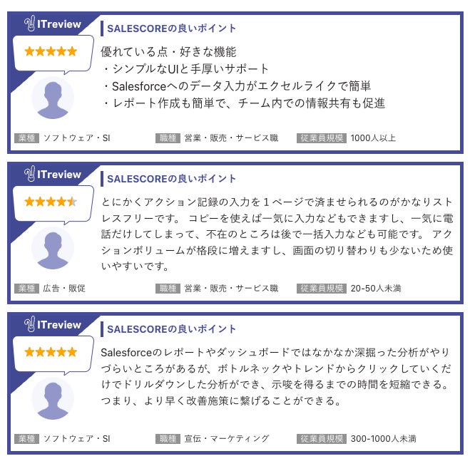 「SALESCORE」のご利用企業様からは、ITreviewにて以下のようなレビューをいただいています。(一部抜粋)