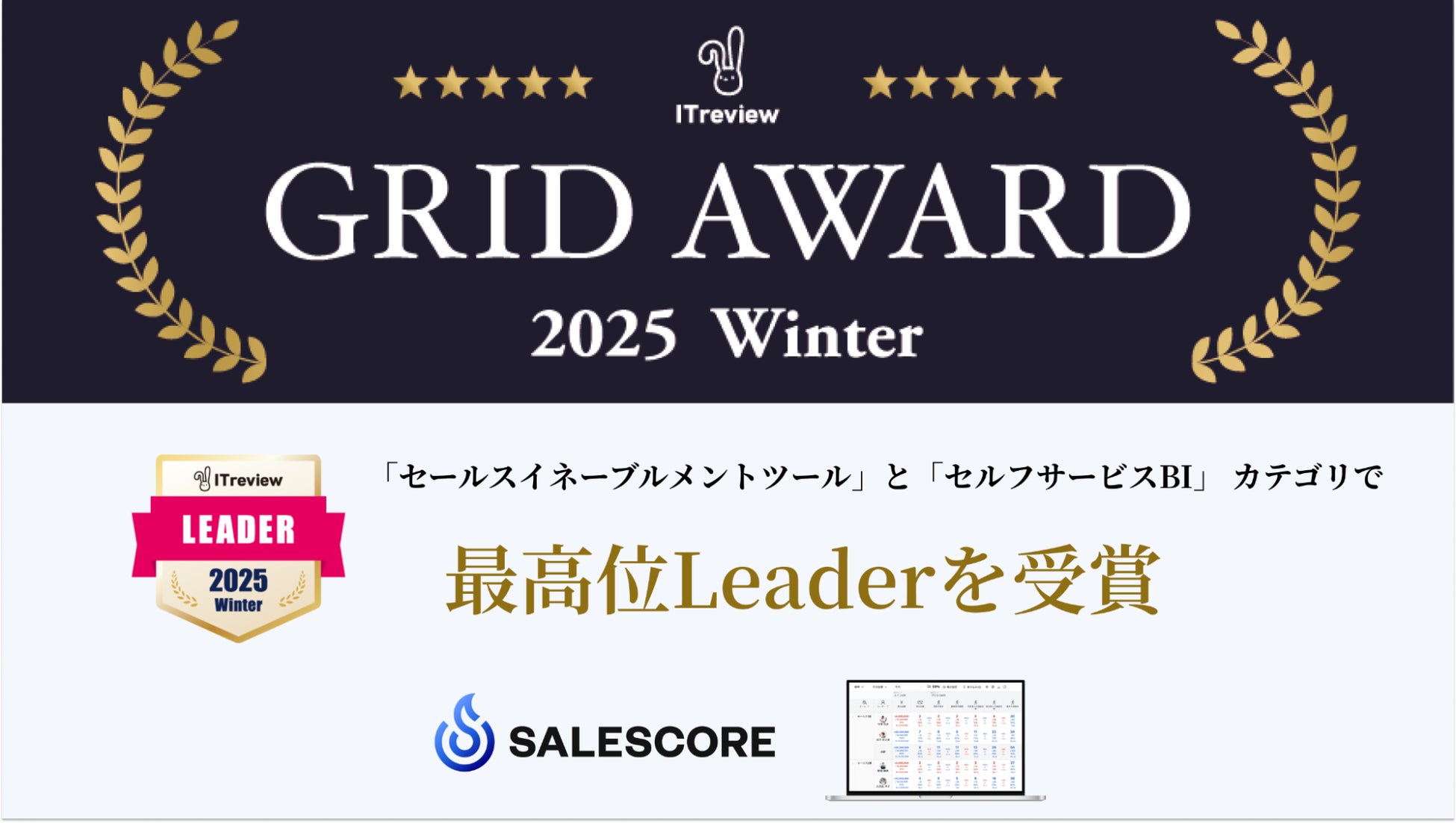 「達成の喜びをあたり前に」をビジョンに掲げるSALESCORE株式会社(本社:東京都渋谷区、代表取締役:中内崇人)は、B2B向け IT製品/SaaSのレビュープラットフォーム「ITreview」が顧客満足度の高い製品を表彰するITreview Grid Award 2025 Winterにて、「セールスイネーブルメントツール」、「セルフサービスBI」の2カテゴリーでLeader賞を獲得したことをお知らせします。