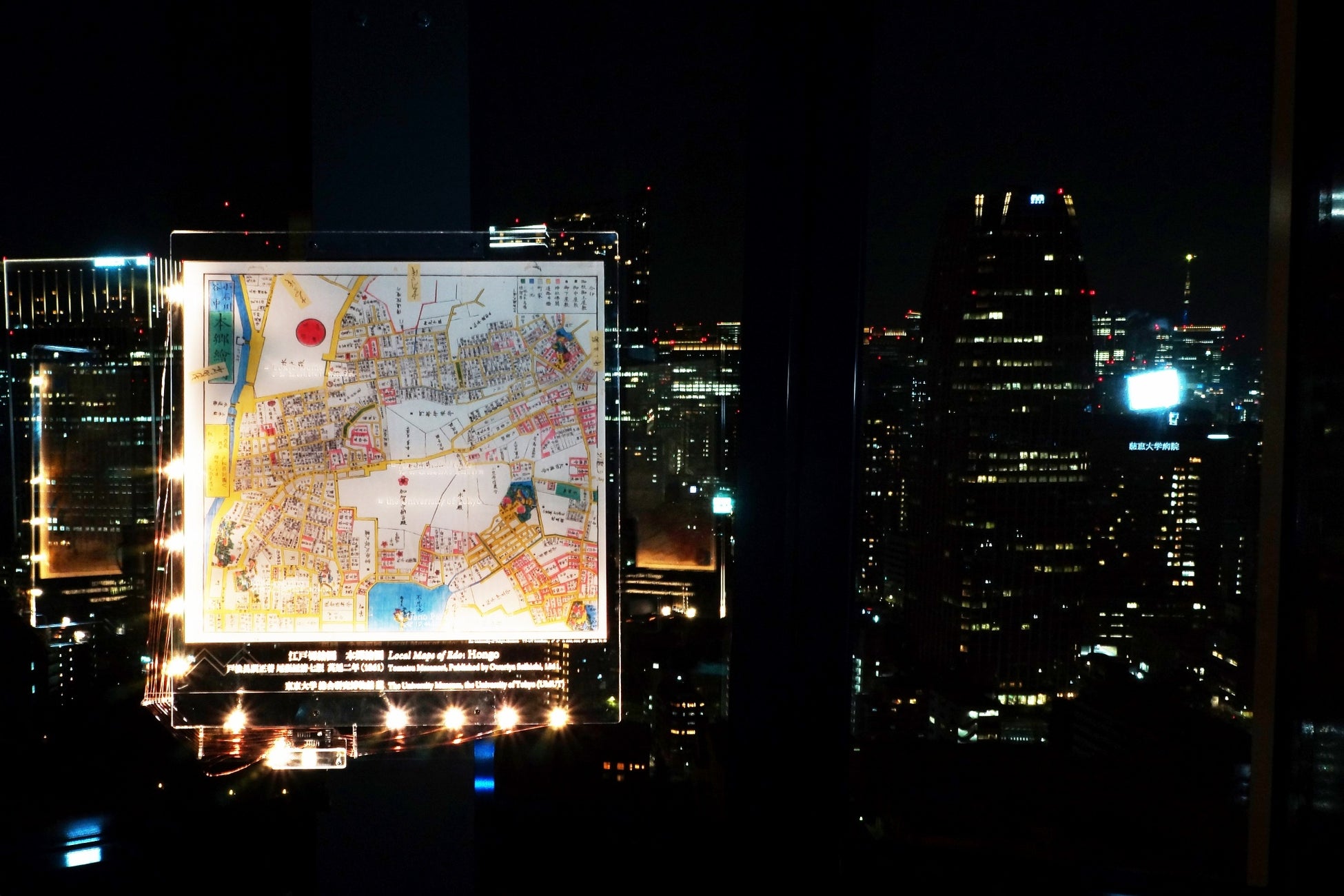 東京の中心から望む風景の中で、サウンドスケープと展示が交じり合い、特に陽が落ちてからの空間は、音景と夜景に展示照明が加わり、より幻想的な空間を演出します。
