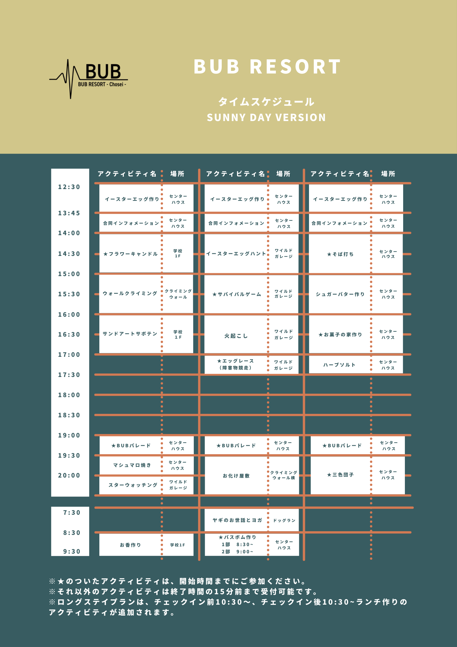 BUB RESORTはシーズンごとに異なり、定員や事前予約不要のアクティビティが特徴で、