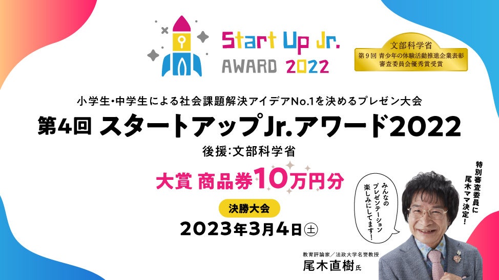 文部科学大臣賞を目指し国内トップレベルの小中学生プレゼンターが集結!小中学生の社会課題解決プレゼン大会「スタートアップJr.アワード2022」ファイナリスト決定!決勝は3月4日、東証Arrowsにて!