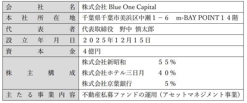 株式会社新昭和(本社:君津市、代表取締役会長 松田 芳彦、以下 新昭和)と株式会社ホテル三日月(本社:木更津市、代表取締役 小髙 芳宗、以下 ホテル三日月)、株式会社京葉銀行(本店:千葉市、代表取締役頭取 藤田 剛、以下 京葉銀行)は、不動産アセットマネジメント業務の開始に向けた共同出資者となり、今般、新会社を設立いたしました。