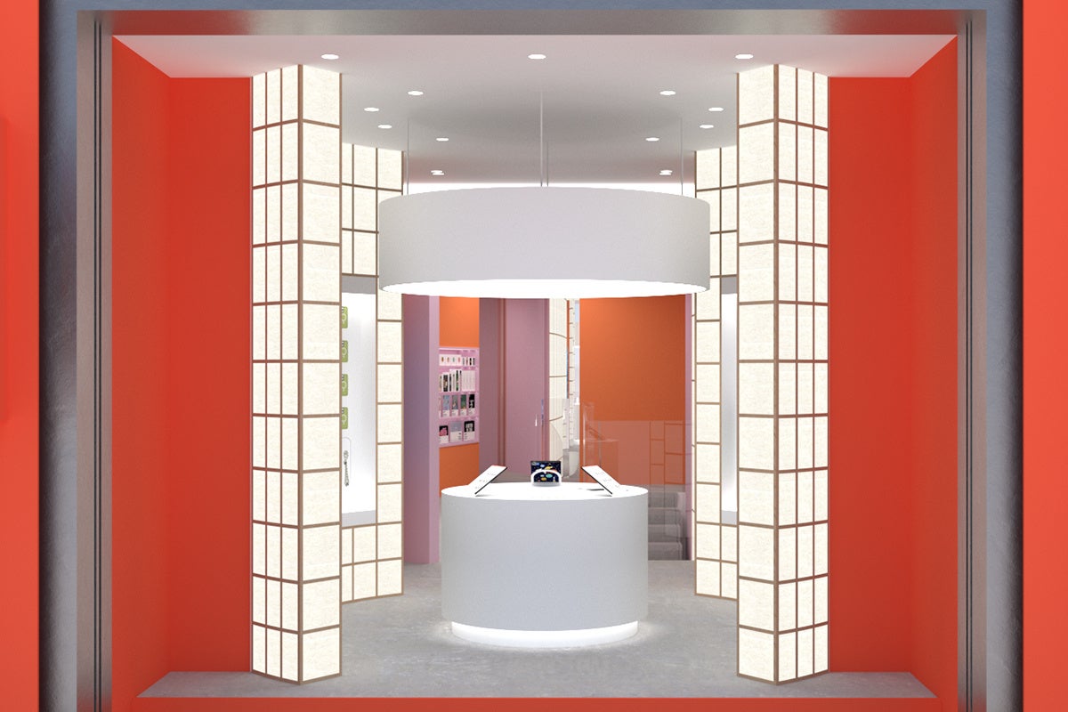 吸い込まれるようなエントランスでは、障子をモチーフにした曲線壁がお客様を温かく迎え、カラー、フォルム、グラフィックが折り重なった空間が広がります。
