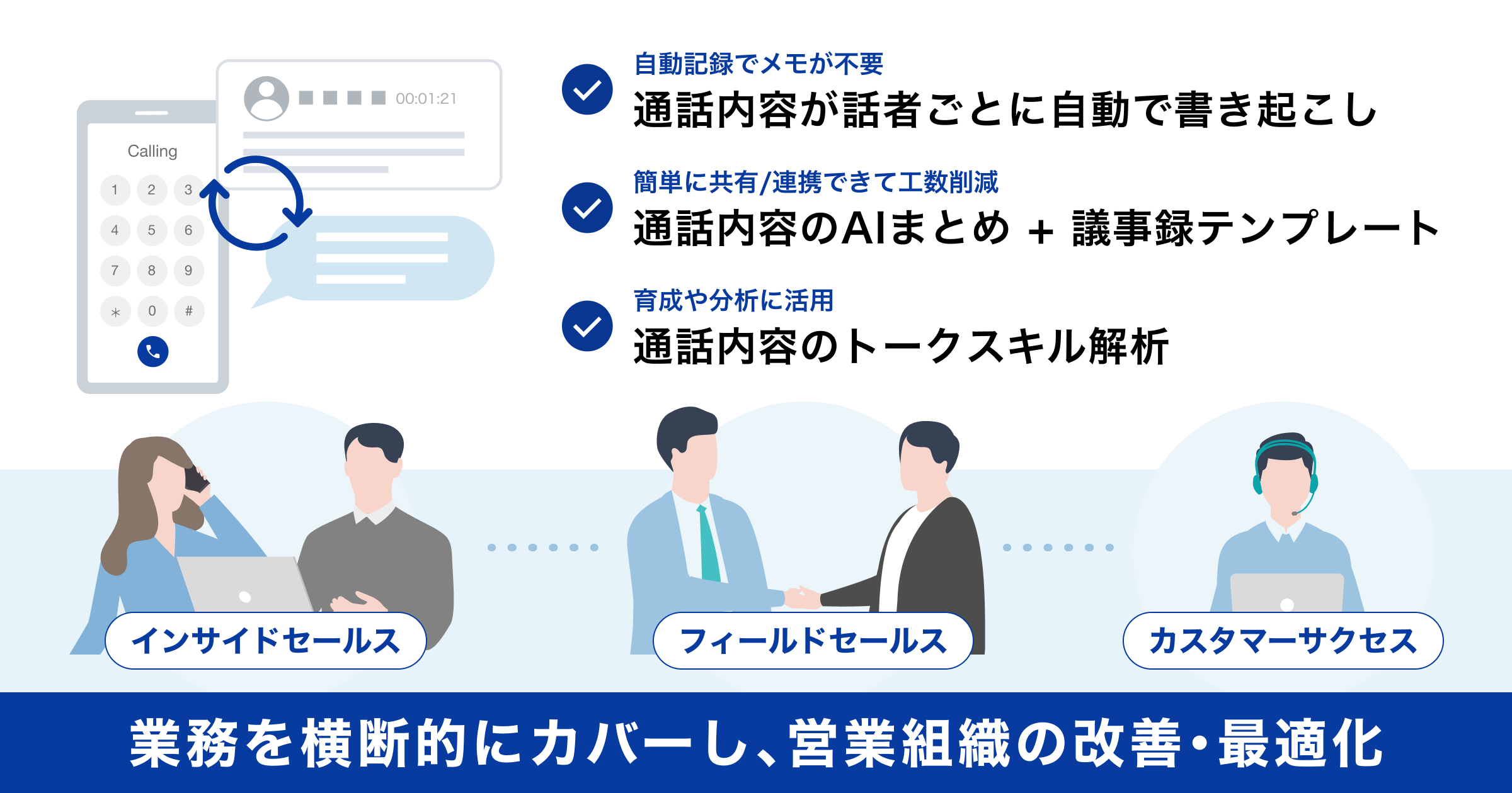 この度、IP電話であるZoom Phoneとの連携が可能になりました。Zoom、Google Meet、Microsoft TeamsといったWeb会議サービスと連携しオンライン商談の書き起こしや解析機能を提供して参りましたが、多くのお客様からのご要望に応えるべくIP電話であるZoom Phoneとの連携を行いました。これにより、IP電話でも通話内容の書き起こしが可能になり、通話内容はAIによってまとめられるようになります。また、通話内容のトークスキル解析にも活用いただけます。