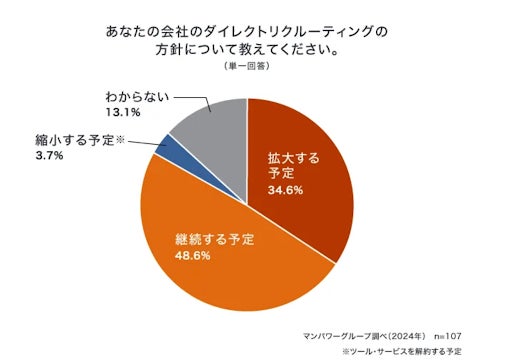 またマンパワーグループの調査結果によると、ダイレクトリクルーティングを実施している人事担当者のうち、 「拡大する予定」 と回答した割合は 34.6%、 「継続する予定」 と回答した割合は 48.6% にのぼり、合計で 8割超 の担当者が「現状維持」または「拡大」の方針を示しました。この結果から、多くの企業がダイレクトリクルーティングの効果を実感し、積極的に活用していることが明らかになっています。