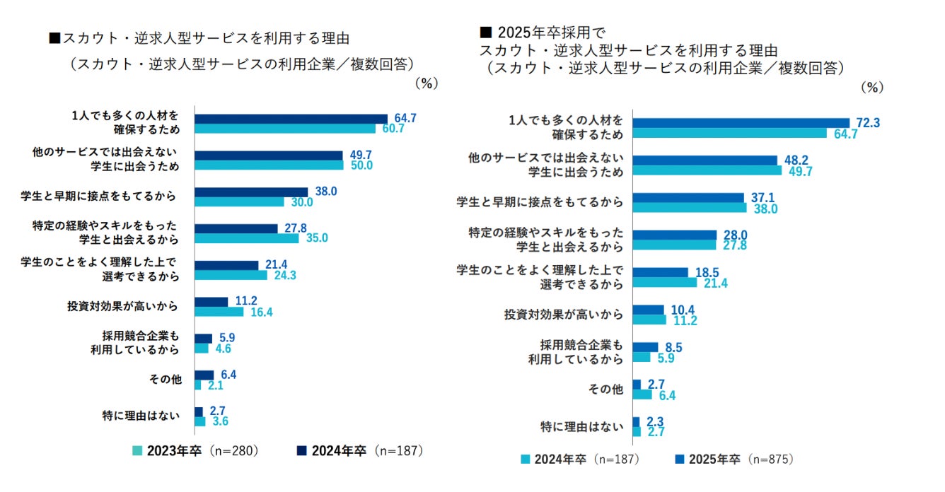 就職みらい研究所の調査によれば、スカウト・逆求人型サービスを利用する理由は、1人でも多くの人材を確保するためが2023年卒では、60.7%、2024年卒では64,7%、2025年卒では72,3%という結果が見られ、年々利用企業も増えていることが分かります。