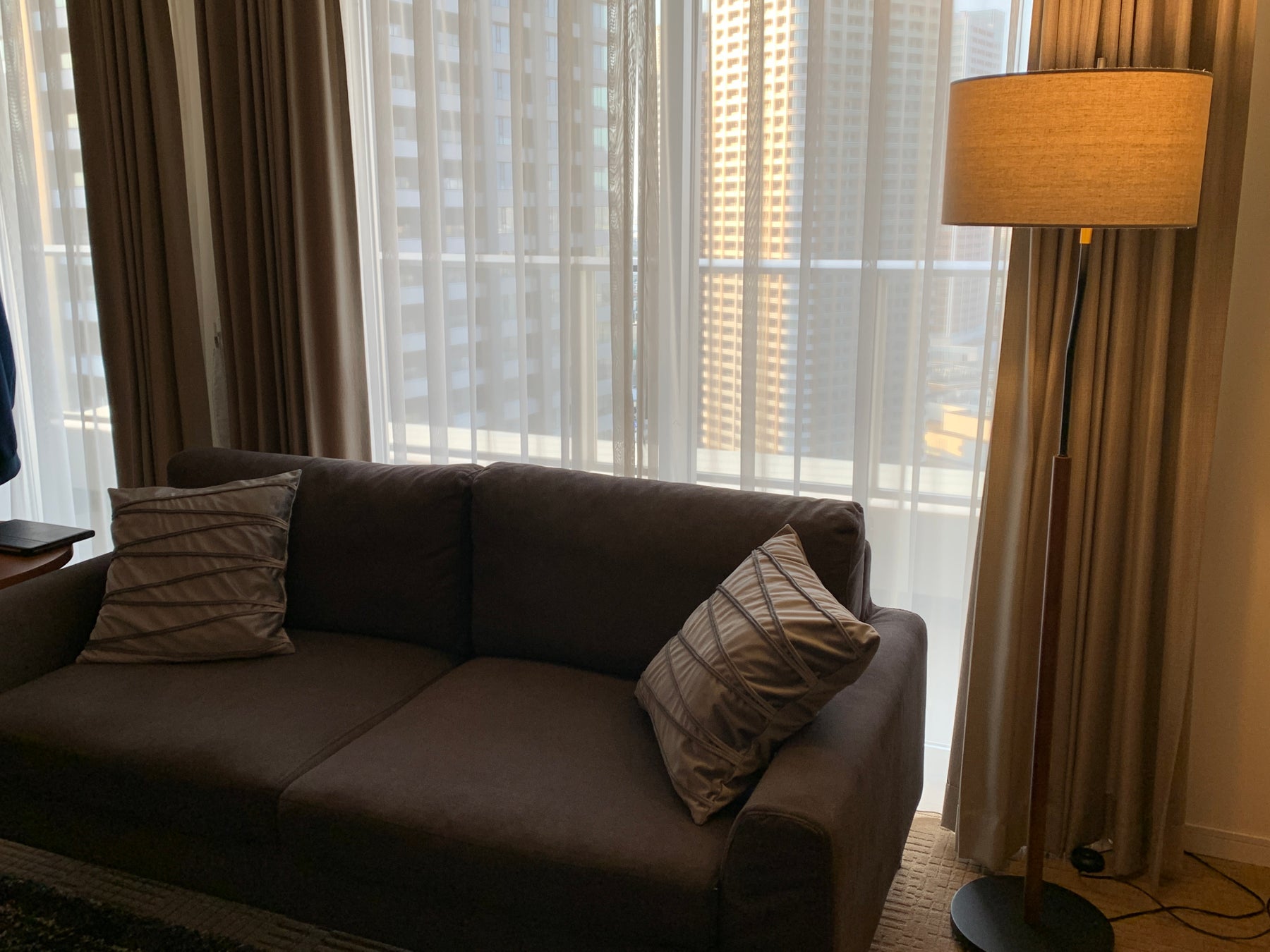 中井貴一さん演じる、都会で孤独に暮らす松永徹の住む自宅リビングに、当社取り扱いのソファや照明を導入いただきました。ブラウンやダークグレーを基調に、落ち着いたシックな雰囲気の空間を装飾しています。