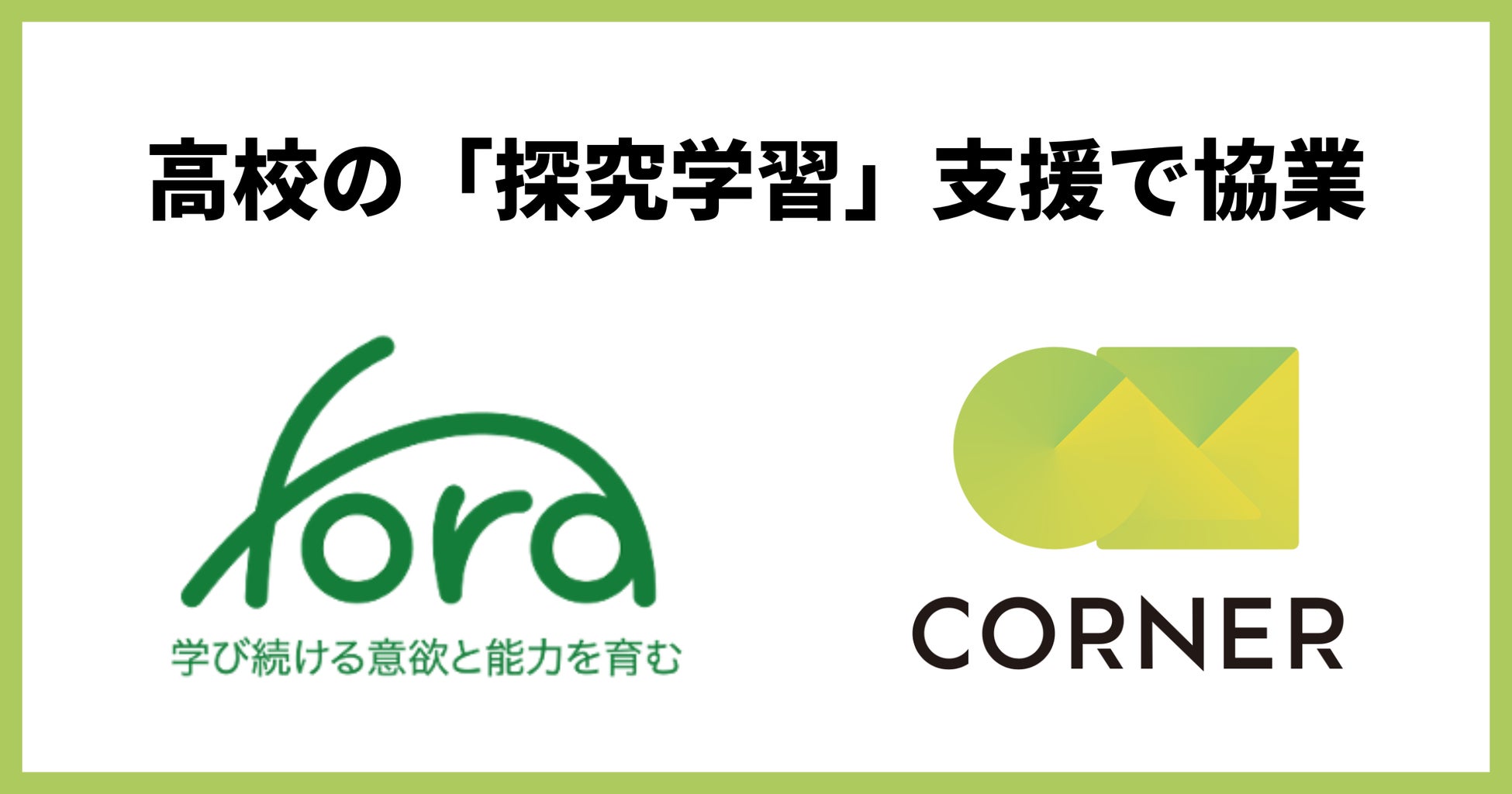株式会社コーナー(所在地:東京都渋谷区 代表取締役:門馬 貴裕、以下コーナー)は、教育現場の課題解決と探究学習の充実を目的に、学校教育支援や教育格差に取り組む一般社団法人Fora(所在地:東京都中央区 代表理事:藤村 琢己、以下Fora)と協業を開始します。