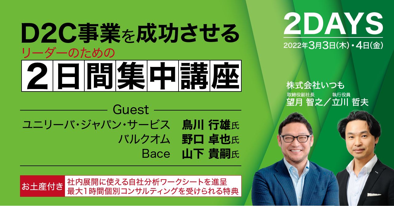 | セミナー名 | 【個別コンサル特典付き】D2C事業を成功させるリーダーのための2日間集中講座 |