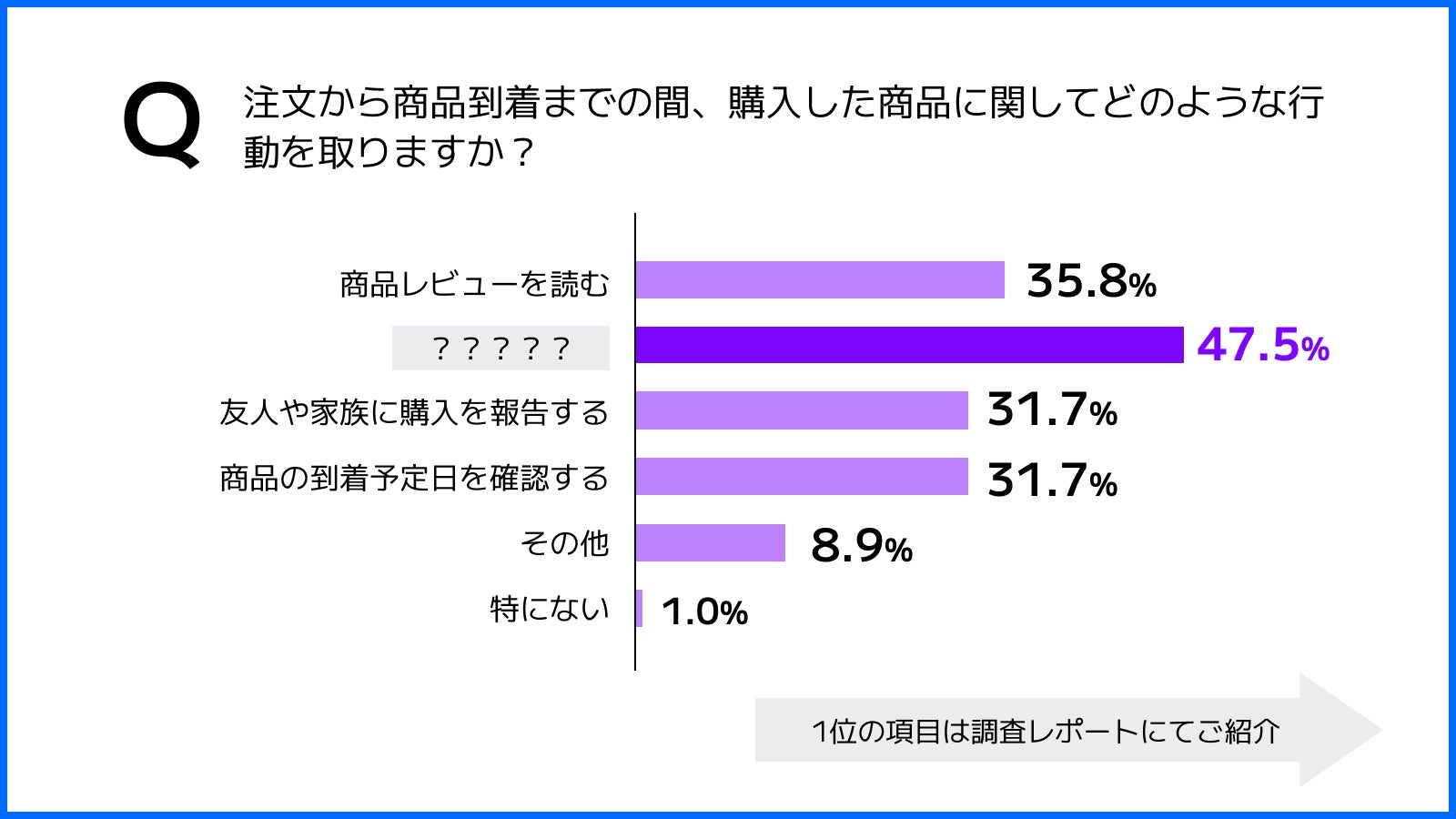 消費者は購入した商品の到着及び、利用することを楽しみにしていることが分かります。また、最も多かった行動に関しては、調査レポート資料にてご紹介しております。