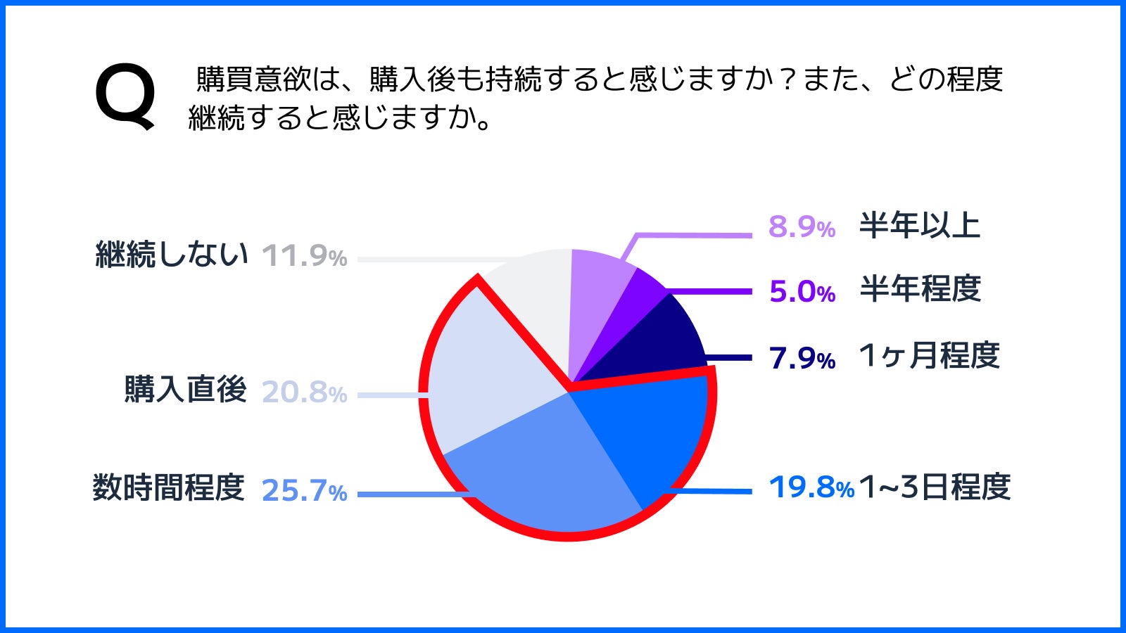 「Q. 購入意欲は、購入後も継続すると感じますか?また、どの程度継続すると感じますか」(n=102名)と質問したところ、「購入直後」が20.8%、「数時間程度」25.7%、「1~3日程度」が19.8%という回答となりました。