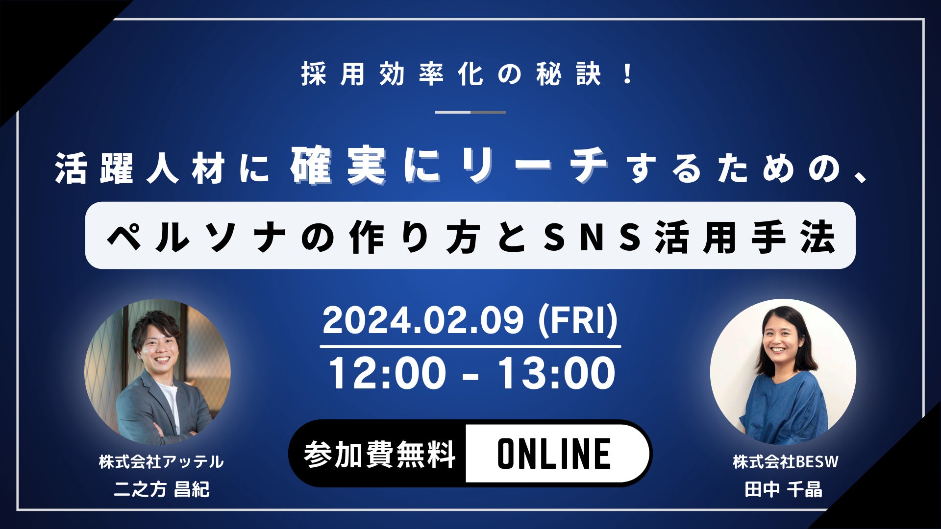 AI適性検査「アッテル(Attelu)」を展開する株式会社アッテル(本社:東京都渋⾕区、代表取締役:塚本 鋭)は、採用担当者向けの無料オンラインセミナー『採用効率化の秘訣!活躍人材に確実にリーチするための、ペルソナの作り方とSNS活用手法』を2024年2月9日(金)に開催いたします。