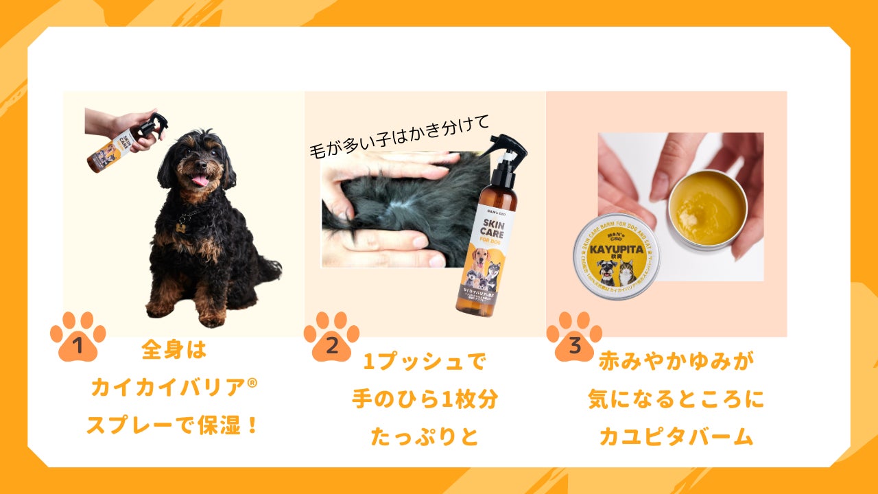 カイカイバリア®スプレーは毎日の全身の保湿に、カユピタ軟膏はポイント使いで。W(ダブル)のスキンケアで、愛犬の健康的な肌作りにお役立てください。