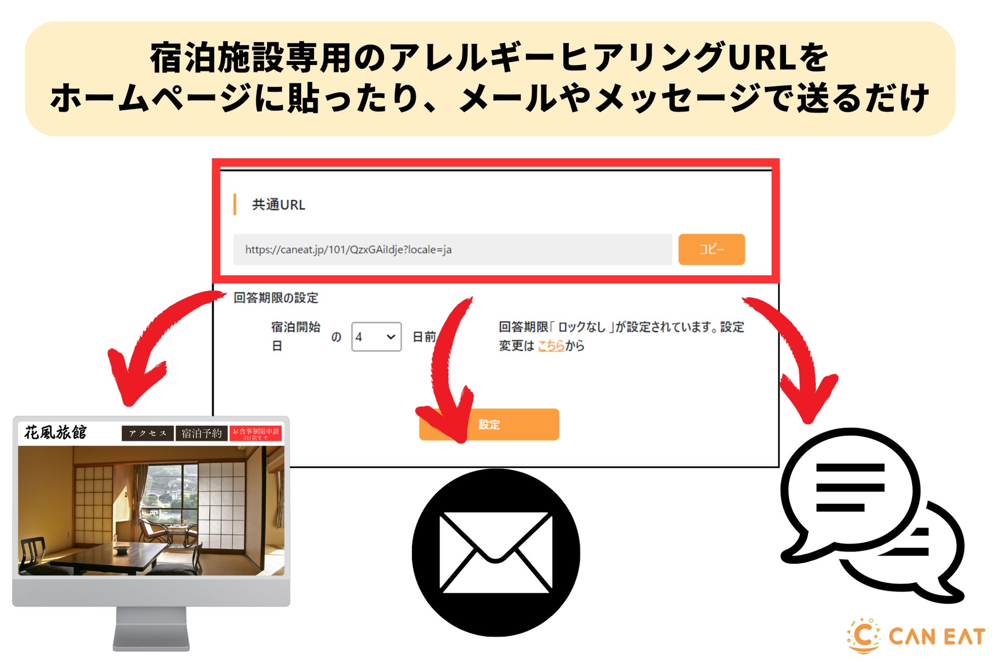 1.宿泊施設専用のURLでアレルギーヒアリングフォームを作成・利用。ホームページやメールでゲストにURLを共有するだけ