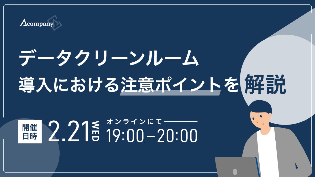 データクリーンルームを提供する株式会社Acompany(アカンパニー、愛知県名古屋市西区、代表取締役CEO 高橋亮祐、以下Acompany)は、データクリーンルームの企画の進め方や注意すべきポイントなどを解説するウェビナー「データクリーンルーム導入における注意ポイントを解説」を、2月21日(水)19:00-20:00に開催します。