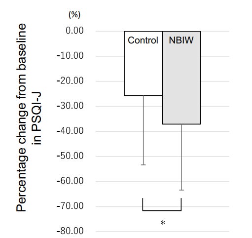 ピッツバーグ睡眠質問票日本語版(PSQI-J:Pittsburgh Sleep Quality Index Japanese version)により、通常入浴よりも中性重炭酸イオン水(NBIW)温浴で睡眠の質に関して有意な改善を認めました。また、活動量計でも通常入浴よりも中性重炭酸イオン水(NBIW)温浴で睡眠潜時(ベッドに入ってから入眠までに要する時間:寝つきの良さを反映)と離床潜時(目覚めてからベッドを離れるまでに要する時間:寝覚めの良さを反映)に関して有意な改善を示し、中性重炭酸イオン水(NBIW)温浴がよりよい睡眠に関して有効であることが実証されました。