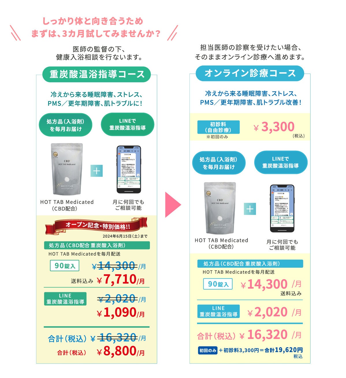 まずは3ヶ月間、ご自宅のお風呂で、本クリニック専用の重炭酸入浴剤を使用する「重炭酸温浴指導コース(医師の監督の下、健康入浴相談を行います)」を、本オンラインクリニックオープン記念の特別価格でご提供します。