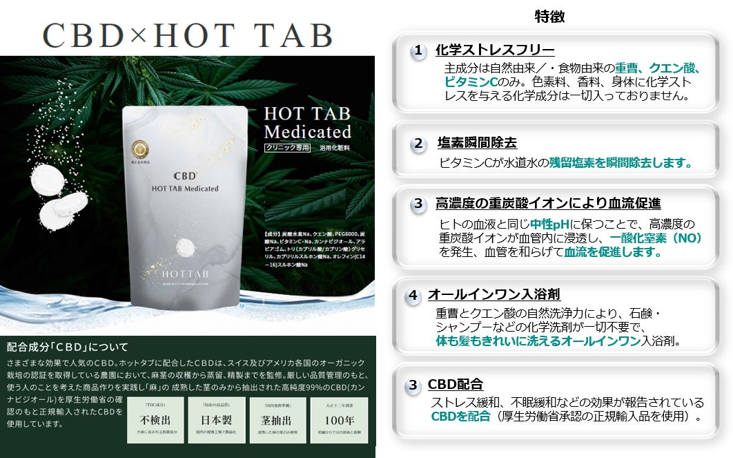 本療法の特徴は、各患者様の自宅のお風呂を利用して、重炭酸イオンが豊富に溶け込んだ「HOT TAB Medicated」入浴剤を使用し、30分以上、41℃以下のぬるめのお湯に浸かることで、自律神経の安定化を図り、体のストレスを改善、血流をアップし、体温上昇による治療を行います。この入浴剤は、重曹、クエン酸、ビタミンCとCBDのみの自然/食品植物由来の成分のみで構成されており、余計な化学ストレスを与える化学物質は一切含まないことで、血流アップを最大化して、治療効果を上げております。