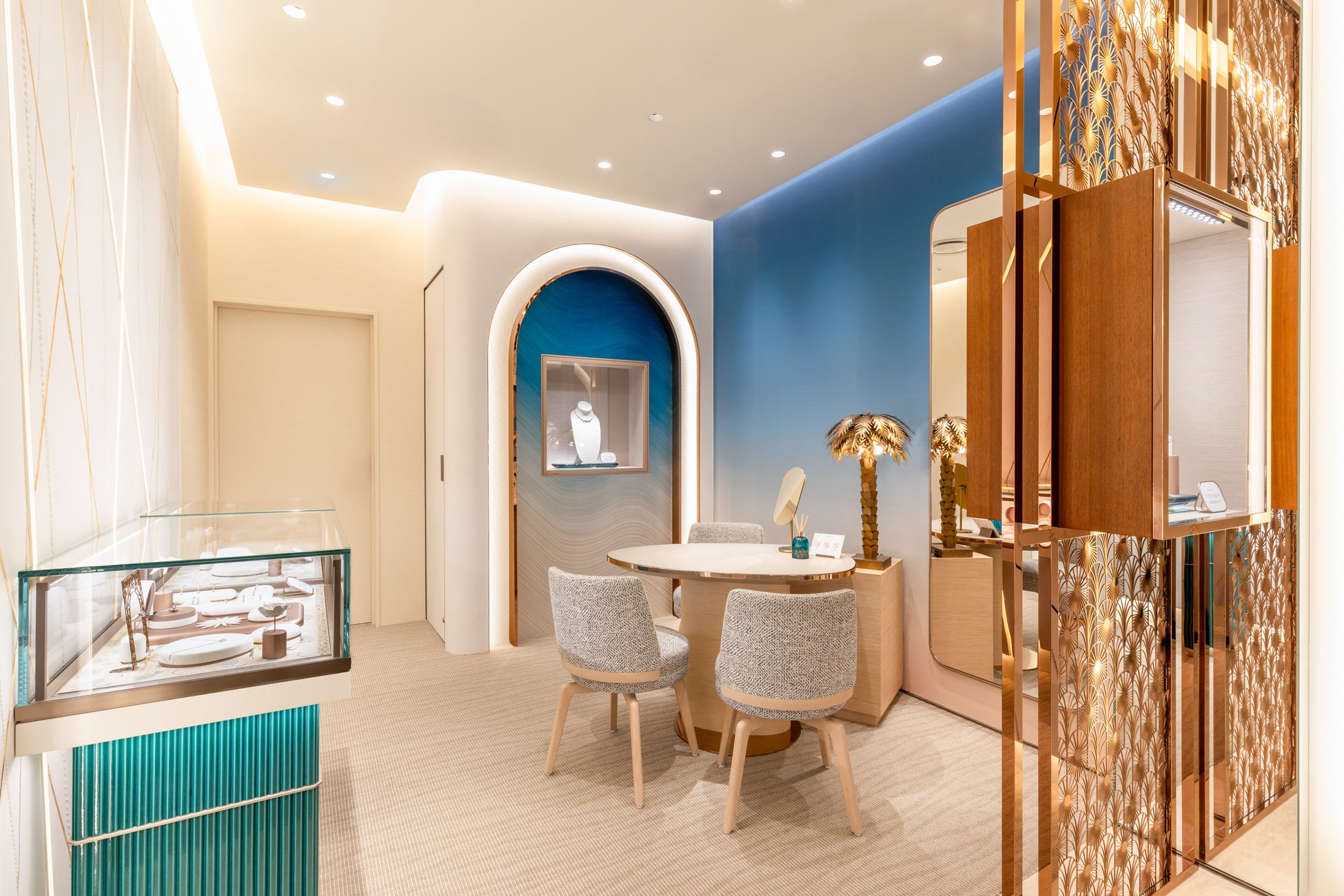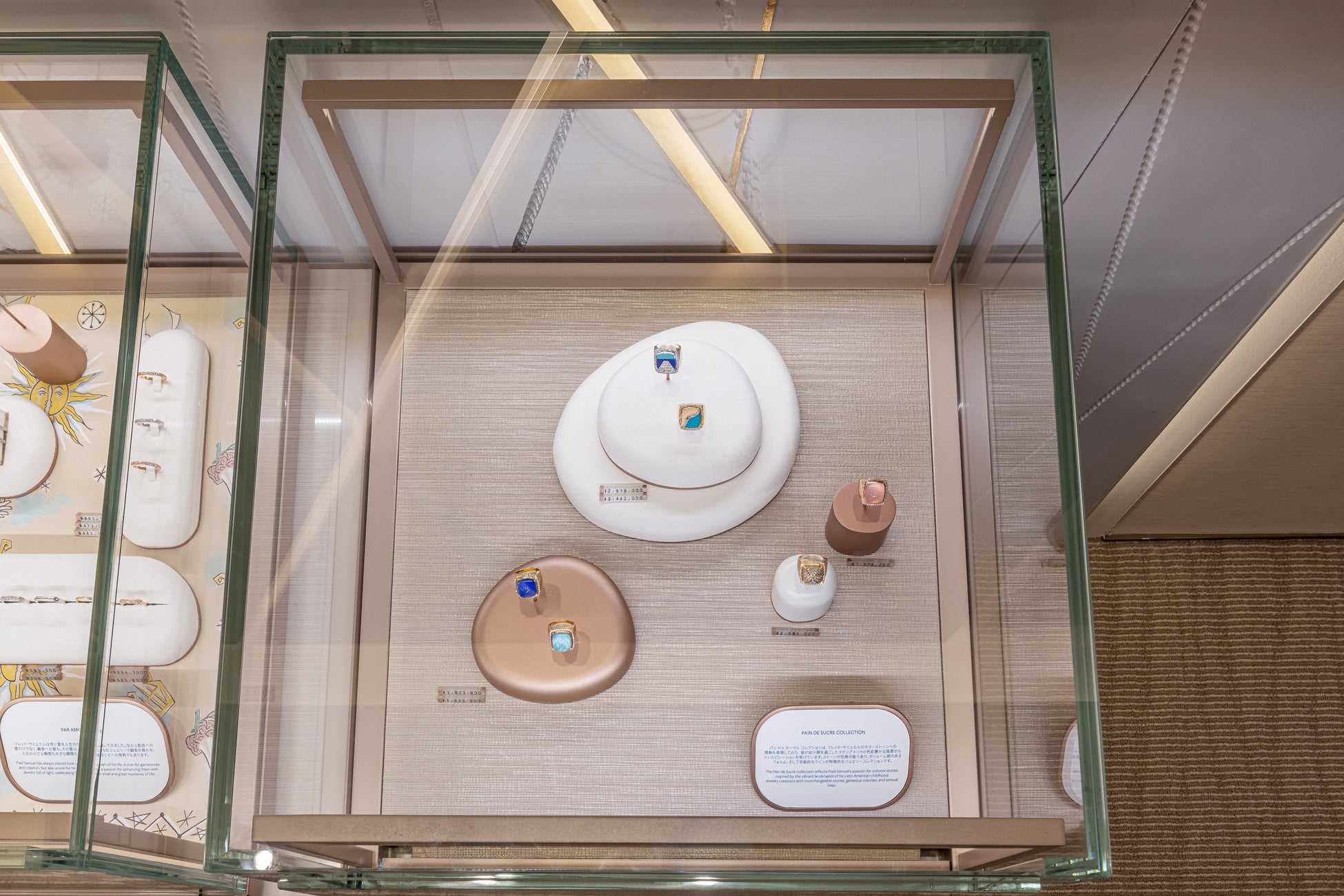 この新しいブティックは、日本の店舗の中で最も多くのフランス人職人による仕上げと素材が使用される初めての店舗となります。カウンターの土台にあしらわれたセラミック、アーチに組み込まれたブルーのグラデーションの壁紙、そしてフレッドとフランス人アーティストによってデザインされたロープパネルなど、これらすべてがメゾンのために特別に作られたものであり、本物の職人技を象徴しています。より快適で没入感のある体験を提供するこの居心地の良い空間は、南仏の輝く光を思わせる、暖かく日当たりの良い雰囲気でお客様をお迎えします。