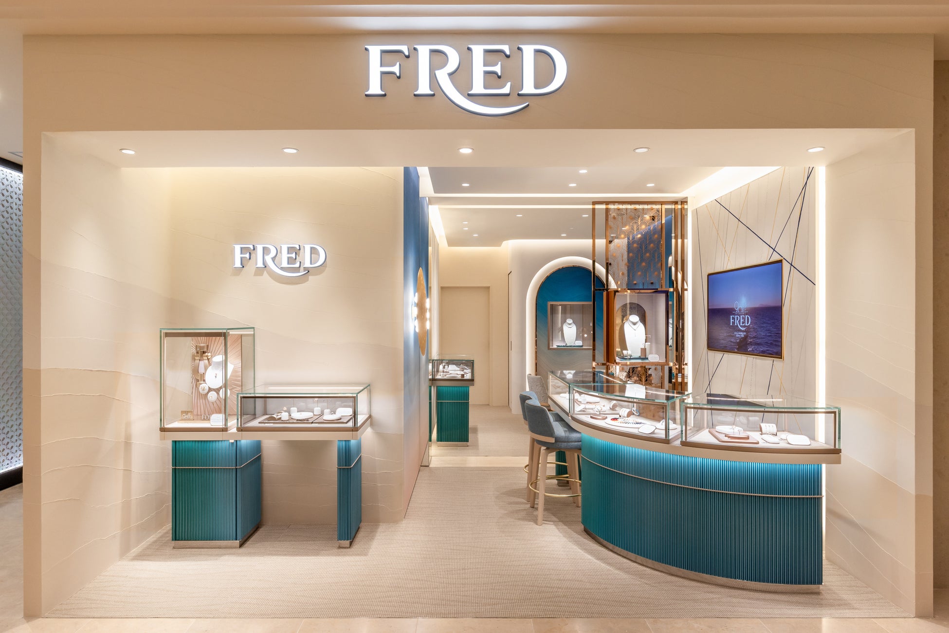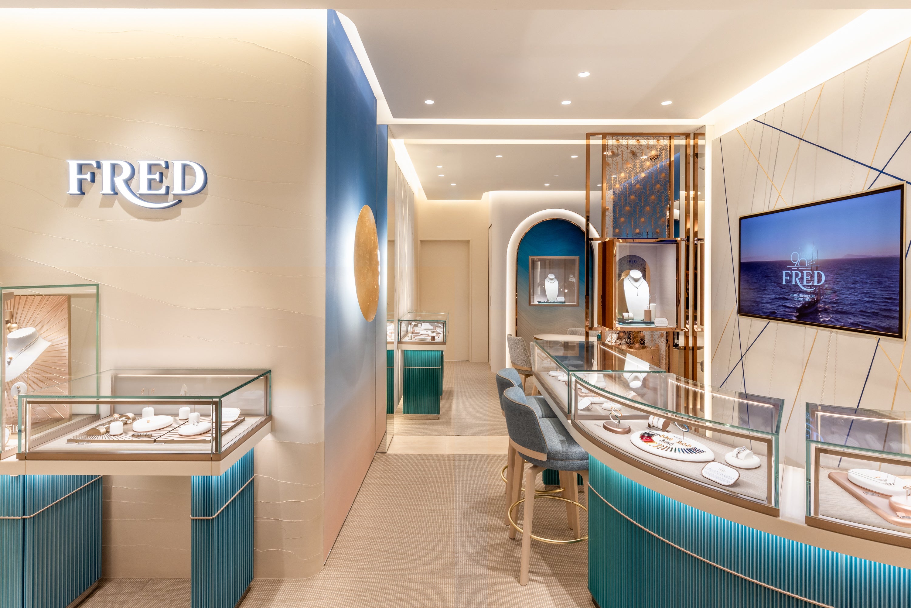 フレッド・サミュエルが愛したフレンチリヴィエラに敬意を表し、この温かい空間は、海と水平線の間のクルーズのように、太陽が降り注ぐジュエリーの世界へと誘います。 この豪華なフロアの中心に位置するブティックは、柔らかなアイボリー色とフレッドブルーの色合いでデザインされており、地中海の砂浜を連想させ、瞬時に海辺の休暇を思い起こさせます。店内に足を踏み入れると、洗練された建築と現代的な美学がシームレスに融合した空間が広がります。インテリアは、メゾンの象徴的なフォース10コレクションと、冒険的なクルーズへ出航する精神を想起させます。