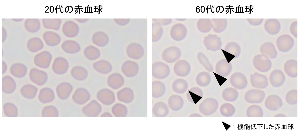 若齢群と加齢群の赤血球を比較した結果、若齢群では正常な赤血球が多く存在していたのに対し、加齢群では機能低下した赤血球の割合が大きくなっていました(図1)※1。