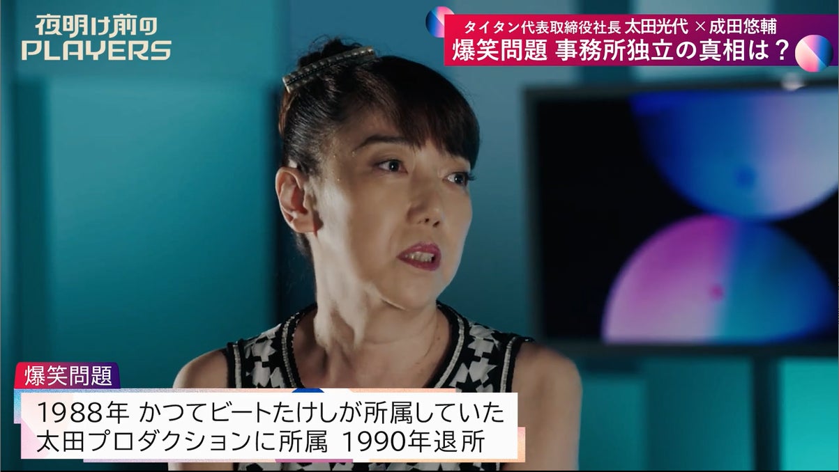 YouTube前編動画では「どうしようもない爆笑問題をマネジメントするために事務所を建てた」「『ありえない、続かない』と思われていた事務所設立」「パントマイムに嫌気がさした芸能養成学校時代」「いま、若手でも独立できる理由」「働かずに専業主婦になりたかった」「高2で始めた一人暮らしと捜索願、退学の危機」「バブルの崩壊と爆笑問題の崩壊」「『ビートたけしの再来』という太田光評」など、TV未公開シーンを含む太田さんと成田さんの対談が展開されています。