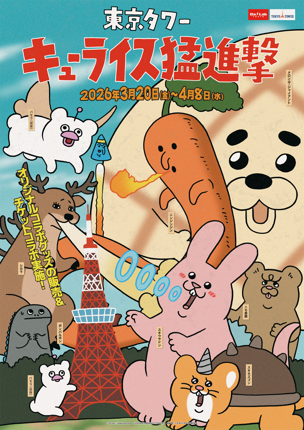 トラストトウキョウ株式会社(本社:東京都渋谷区)が運営する東京タワー内「Co・Lab-TOKYO-」は2026年3月20日(金)~4月8日(水)にて絵本作家であり漫画家のキューライスと東京タワーがコラボする『東京タワー キューライス猛進撃』を開催いたします。キューライスと東京タワーのコラボイベントをお楽しみください。