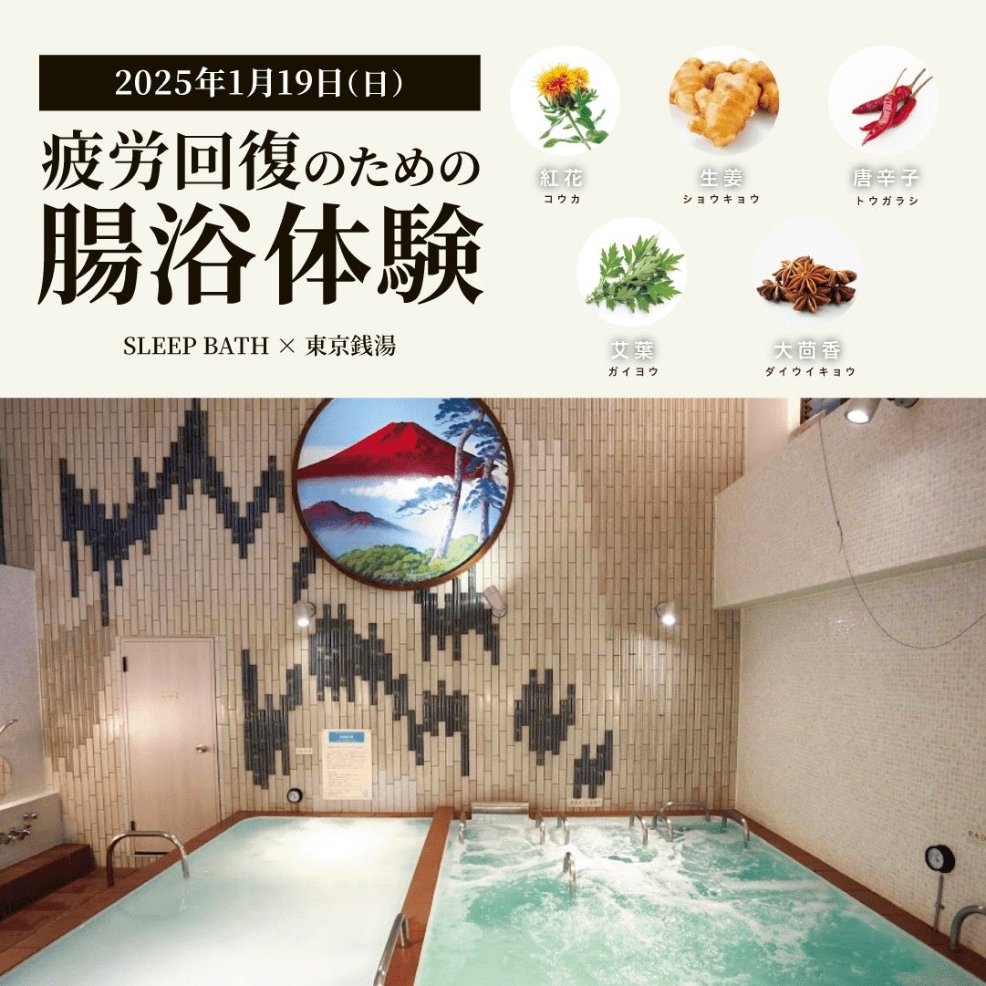 イベントは、「疲労回復のための、腸浴体験」と題して、各店の湯船の一つを、入浴に適した40度程度の“ぬるま湯”に設定し、当社新商品「SLEEP BATH(スリープバス)」を使用した入浴をしていただけます。 新商品は、疲労回復効果のある医薬部外品で、ぬるめのお湯でも体を芯から温めることができるように生薬をオリジナル処方で配合しています。その独自の生薬ブレンドの力を今回、銭湯で体感していただけます。
