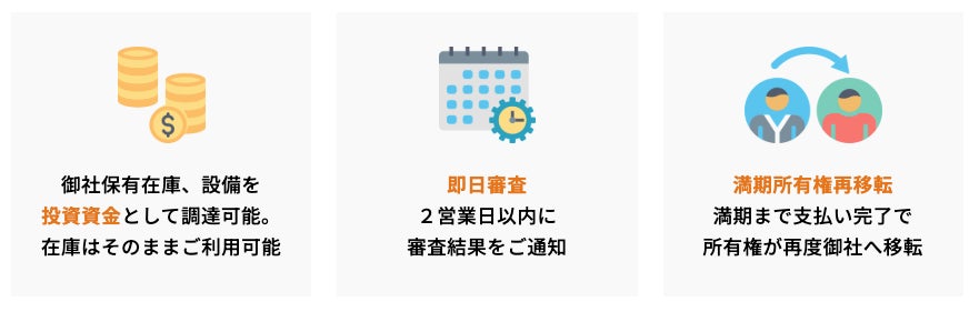 自社が保有する在庫や設備を資金調達の対象として活用することが可能です。在庫はそのままご利用いただけるため、業務への影響を最小限に抑えたまま、資金調達が可能です。即日審査対応、最短で3営業日以内に審査結果のご案内が可能です。契約満期時には、対象設備・在庫の所有権を利用企業へ再移転します。